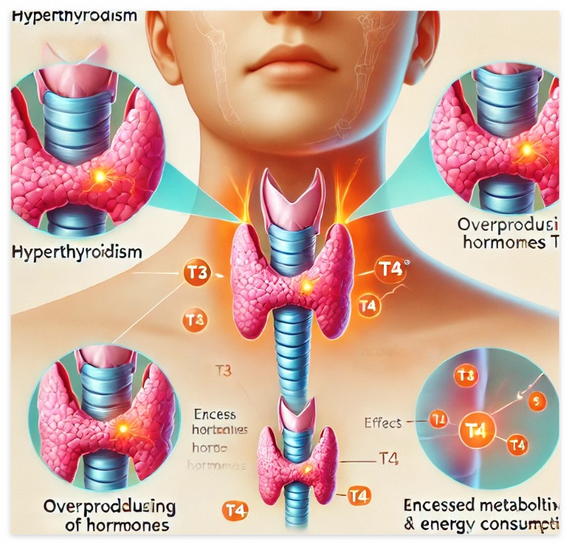 갑상선 기능 항진증은 갑상선이 과도하게 호르몬(T3, T4)을 분비하면서 발생하는 질환입니다. 이 호르몬들은 신진대사를 조절하는 중요한 역할을 하기 때문에, 너무 많이 분비되면 신체가 과도하게 에너지를 소모하고 여러 가지 문제가 발생하게 됩니다.