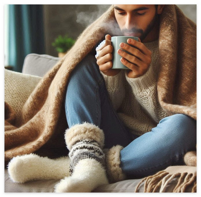 추운 날씨에는 따뜻한 옷과 양말을 꼭 챙겨 입으세요. 특히 발을 압박하는 신발보다는 발을 넉넉히 감싸주는 두꺼운 양말이나 슬리퍼를 신는 것이 좋습니다. 친구는 날씨가 추울 때 실내에서도 따뜻한 슬리퍼를 신고 다니면서 큰 효과를 보았다고 합니다.