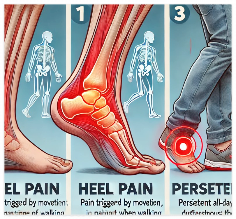 대부분 발뒤꿈치 안쪽에 집중되며, 특히 아침에 첫 걸음을 뗄 때 심해집니다.