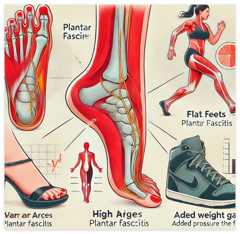 족저근막염의 주요 원인은 발바닥에 가해지는 과도한 압력과 반복된 미세 손상이에요. 대표적인 원인은 다음과 같습니다: