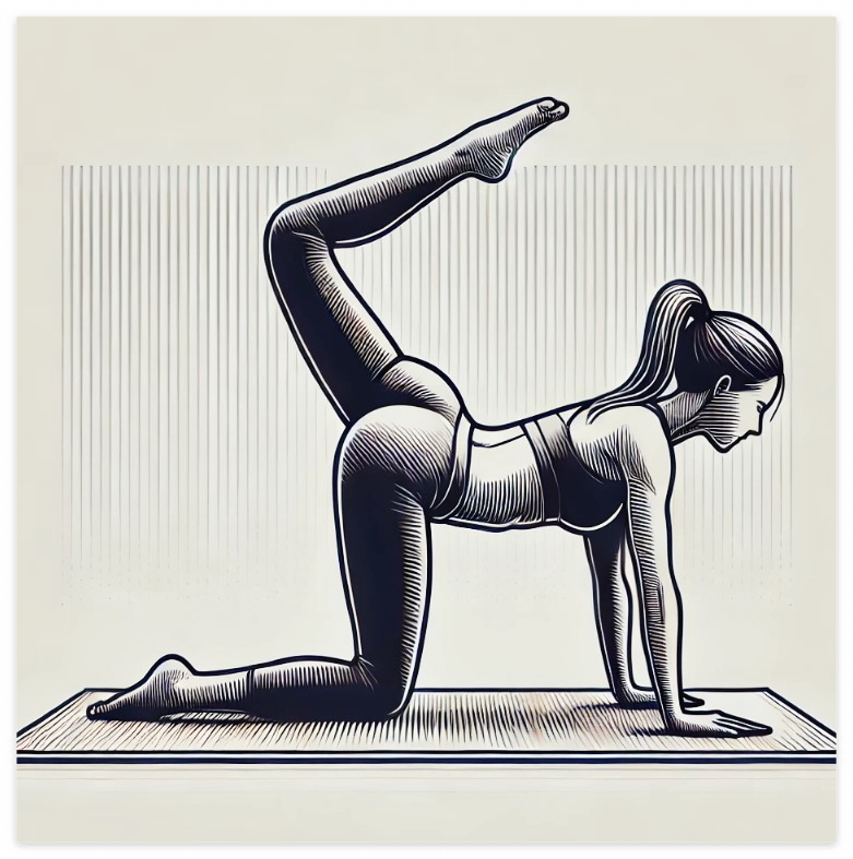 다리 들어 올리기: 한쪽 다리를 천천히 뒤로 들어 올리며 엉덩이 근육을 수축시킵니다. 무릎은 약간 굽힌 상태를 유지하고, 허리를 과도하게 꺾지 않도록 주의하세요.