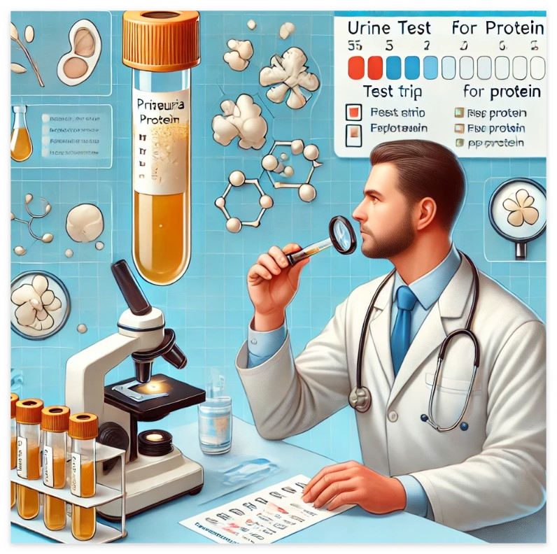 단백뇨가 의심되면 소변 검사를 통해 진단할 수 있습니다. 시험지 검사법(dipstick test)은 간편하게 단백질 농도를 확인할 수 있는 방법으로, 소변에 시험지를 담가 단백질 농도를 추정합니다.
