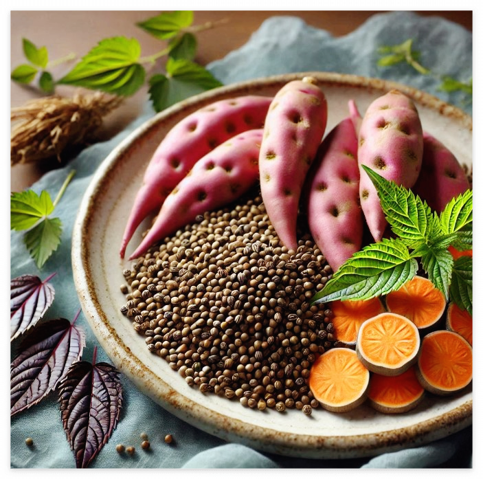 고구마의 식이섬유와 들깨의 장 건강 효과가 결합해 변비 예방과 체중 조절에 도움을 줘요.