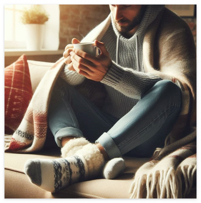 추운 날씨에는 따뜻한 옷과 양말을 꼭 챙겨 입으세요. 특히 발을 압박하는 신발보다는 발을 넉넉히 감싸주는 두꺼운 양말이나 슬리퍼를 신는 것이 좋습니다. 친구는 날씨가 추울 때 실내에서도 따뜻한 슬리퍼를 신고 다니면서 큰 효과를 보았다고 합니다.