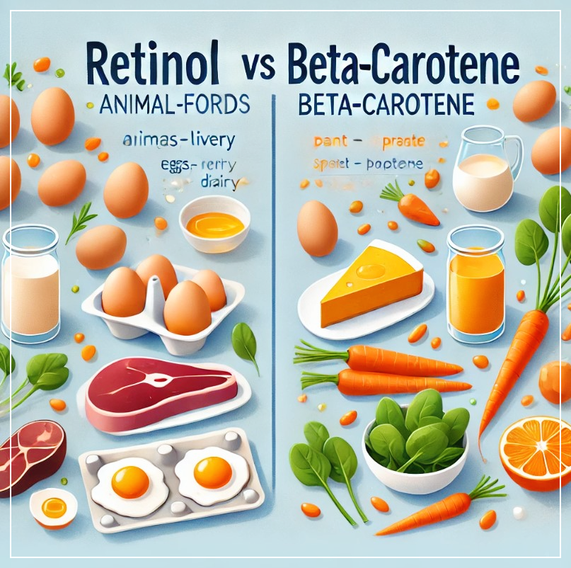 - 레티놀(활성형 비타민 A): 주로 동물성 식품에 포함되어 흡수율이 높습니다.