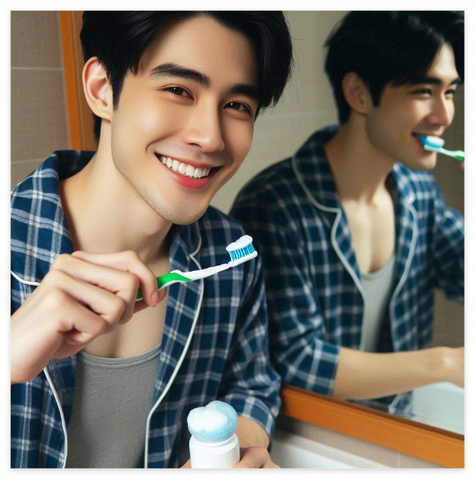 하루 2회 이상 올바른 양치질을 합니다. 칫솔을 45도 각도로 치아와 잇몸 경계에 대고 부드럽게 닦습니다. 하지만 치아 틈새는 칫솔로도 다 닦이지 않는데, 이는 치실과 치간 칫솔로 관리합니다.